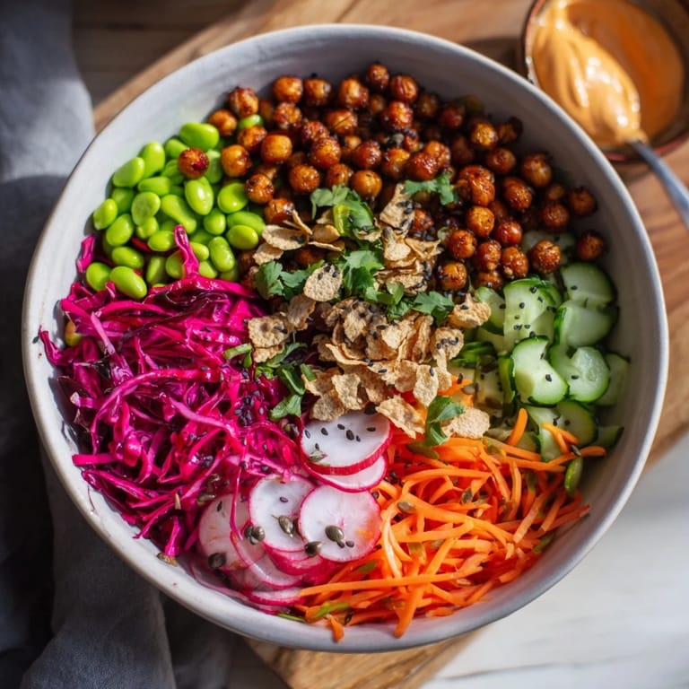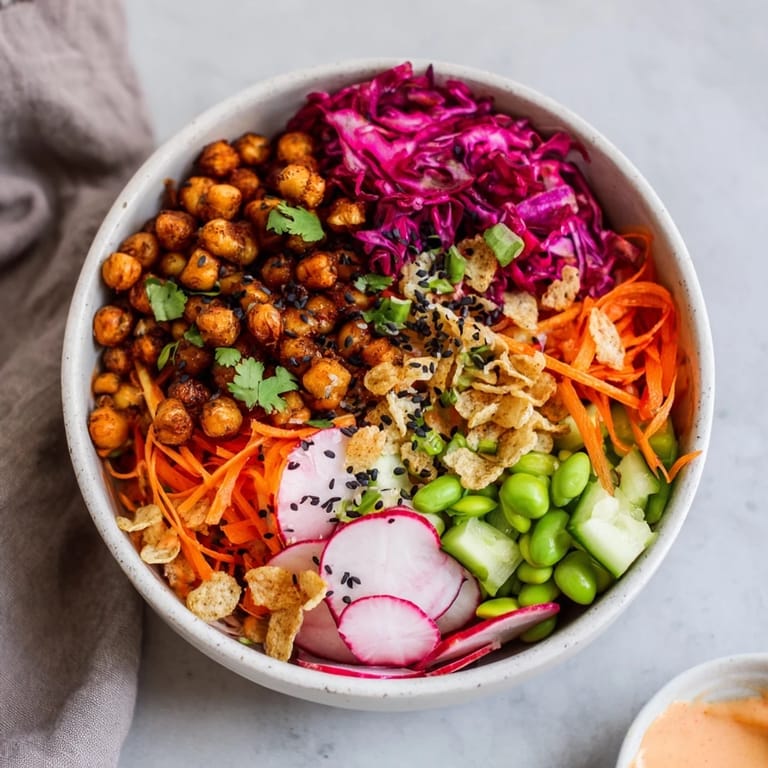 - Top each bowl with roasted chickpeas, crispy rice puffs or cornflakes, pumpkin seeds, and sliced radishes.
