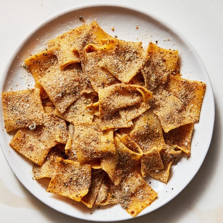 Pin it Crispy baked pasta chips tossed with a flavorful blend of seasonings, perfect for snacking or serving with dips.