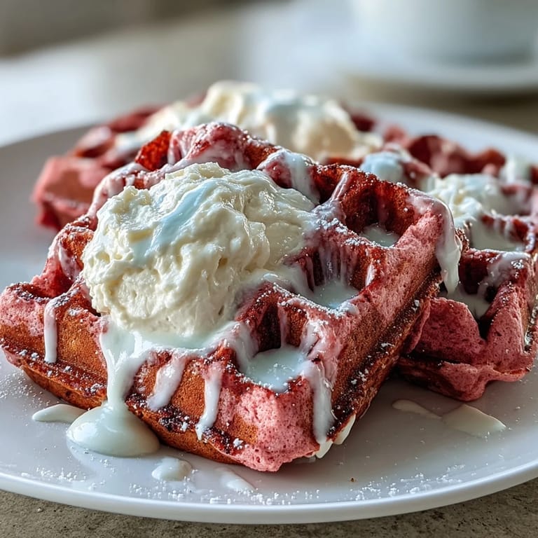 Pin it The magic of these waffles lies in their simplicity. A handful of dry pantry staples—flour, cocoa powder, baking powder, baking soda, salt, and sugar—come together with a vibrant wet mixture of eggs, buttermilk, melted butter, vanilla, and a generous dash of red or pink food coloring gel. The result is a batter that transforms your waffle iron into a canvas of rosy, cocoa-kissed perfection. And that cream cheese drizzle? It is whipped up in minutes while the waffles cook, making every second of your 35-minute window count.