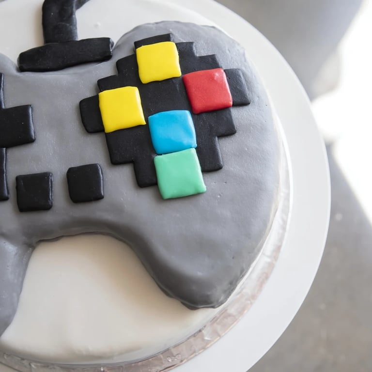 Pin it A playful, pixel-inspired cake shaped like a video game controller, perfect for gaming enthusiasts. Moist layers of vanilla cake are covered with vibrant fondant to capture the nostalgic pixelated look.