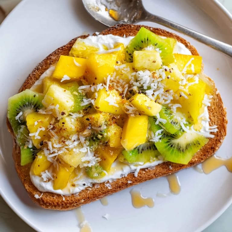 Pin it A vibrant, creamy take on the viral custard toast, featuring coconut yogurt and a medley of fresh tropical fruits. The perfect balance of crisp, creamy, and fruity goodness for breakfast or brunch.