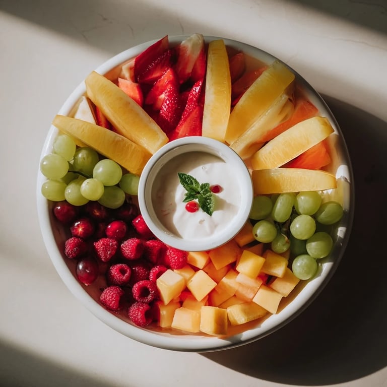 This bright and colorful fruit platter showcases a variety of fresh fruits arranged in segments resembling a beach ball. Featuring strawberries, pineapple, blueberries, grapes, oranges, and watermelon, this dish offers a refreshing balance of flavors and textures. Easy to prepare with no cooking needed, it’s perfect for summertime enjoyment, casual get-togethers, or a healthy snack option. Enhance the presentation with a yogurt dip and fresh mint leaves for added freshness and appeal.
