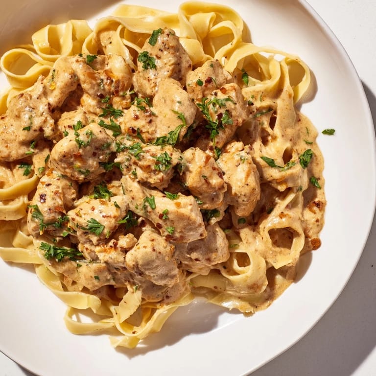 Pin it A bold, creamy pasta dish featuring tender chicken, zesty spices, and a buttery garlic-Parmesan sauce with a hint of cayenne. Perfect for a comforting dinner with a kick.