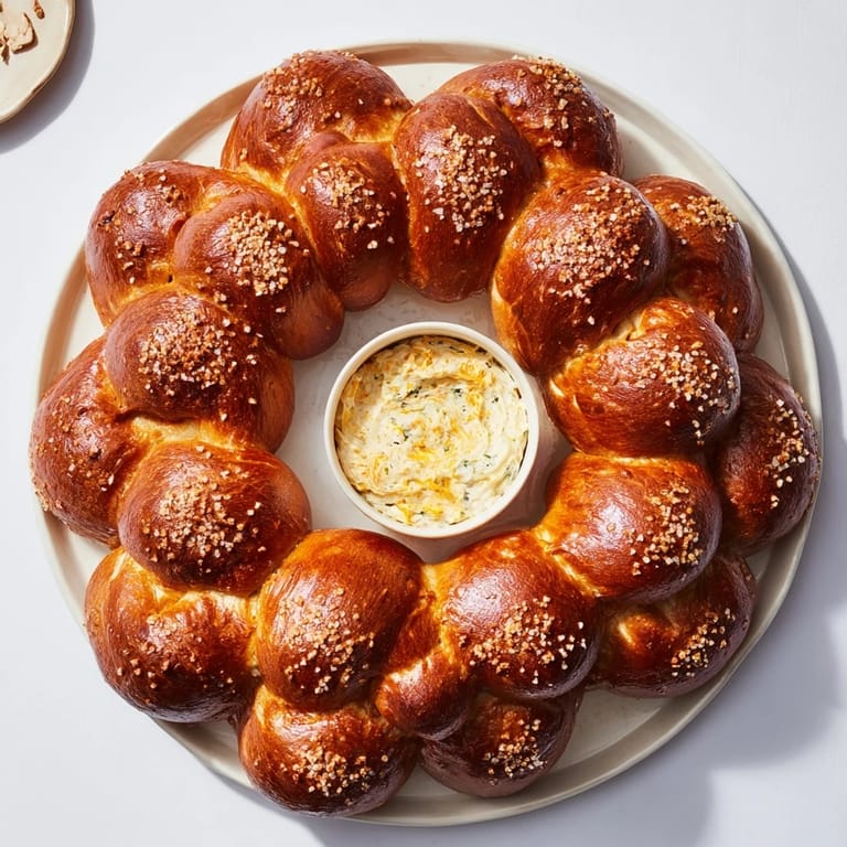 Pin it A festive and shareable appetizer featuring soft pretzel bites baked in a wreath shape, perfect for dipping into a creamy, cheesy spinach dip at the center.
