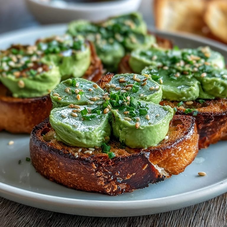 This quick and easy dish features crisp toasted whole grain bread topped with thinly sliced avocado cut into shamrock shapes. Tossed lightly with lemon juice and salt to keep freshness, the avocado is then generously sprinkled with everything bagel seasoning for a flavorful crunch. Garnished with fresh chives or microgreens, it suits a festive breakfast or light snack. Ready in just 15 minutes, it offers a delightful texture and a burst of savory, fresh flavors perfect for any casual occasion.